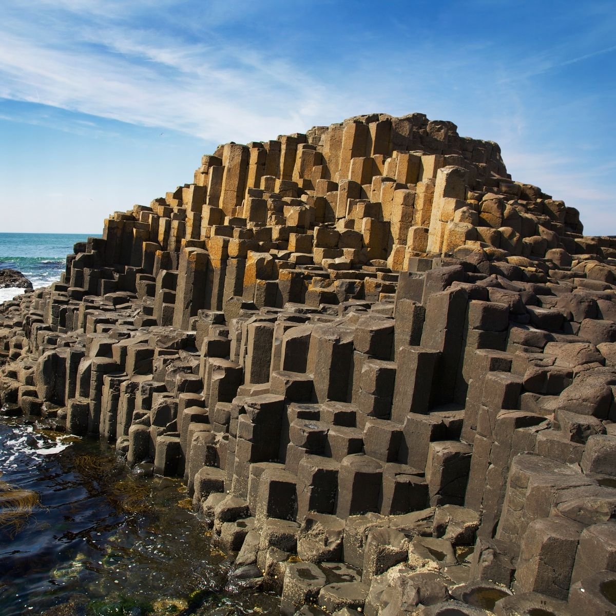The Giant’s Causeway is an area of about 40,000 interlocking basalt columns, the result of an ancient volcanic fissure eruption.